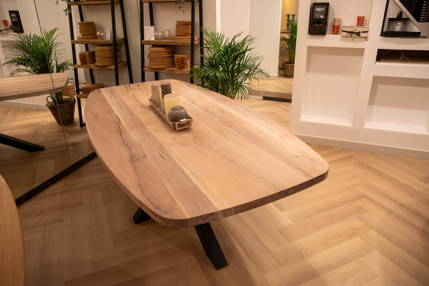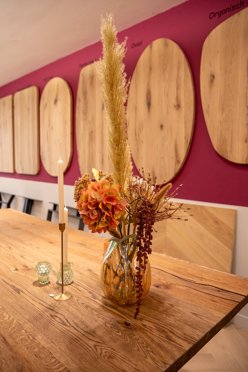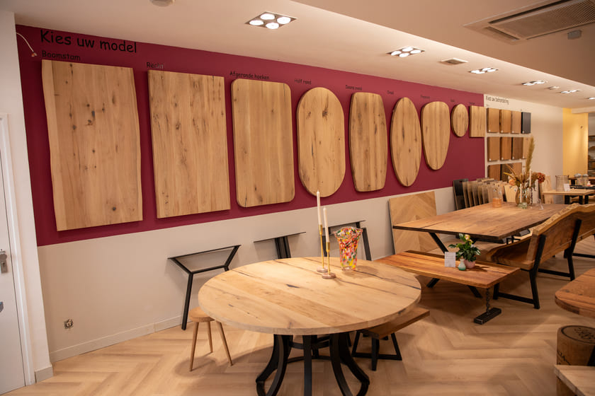 In onze vernieuwde showroom in Harderwijk ontdekt u onze verschillende modellen tafelbladen en tafelpoten. Hier kiest u persoonlijk het tafelblad dat bij uw stijl past – inclusief de nerven, kleurschakeringen en knoesten die ú mooi vindt. Samen met een passend onderstel stelt u zo uw ideale tafel samen.