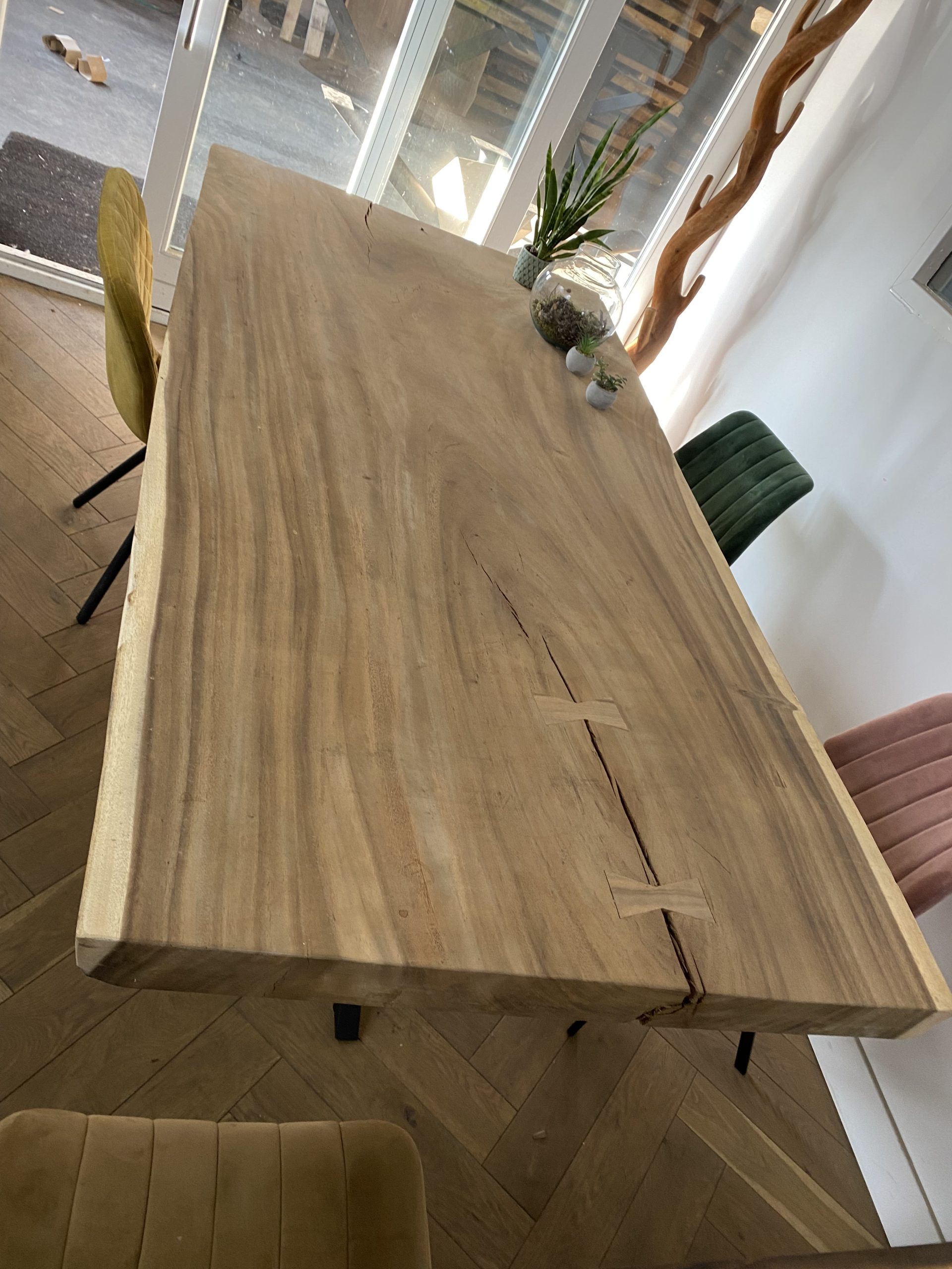 Dit tafelblad is voorzien van twee stalen pinnen tegen het krom trekken van het blad. Het blad is volledig uit één deel (plak van een boom). Hierdoor heeft het blad echt de natuurlijke uitstraling. Het blad op de foto is nog onbehandeld en opgeschuurd. Wanneer het blad geschuurd en behandeld wordt krijgt u nog mooier de tekeningen van het hout te zien. Al onze suar tafelbladen zijn te bezichtigen in onze showroom, zo weet u precies wat u kunt verwachten van het blad. Wij adviseren u dan ook om wanneer deze mogelijkheid er is langs te komen in onze showroom. Voor openingstijden en adres kunt u hier terecht.