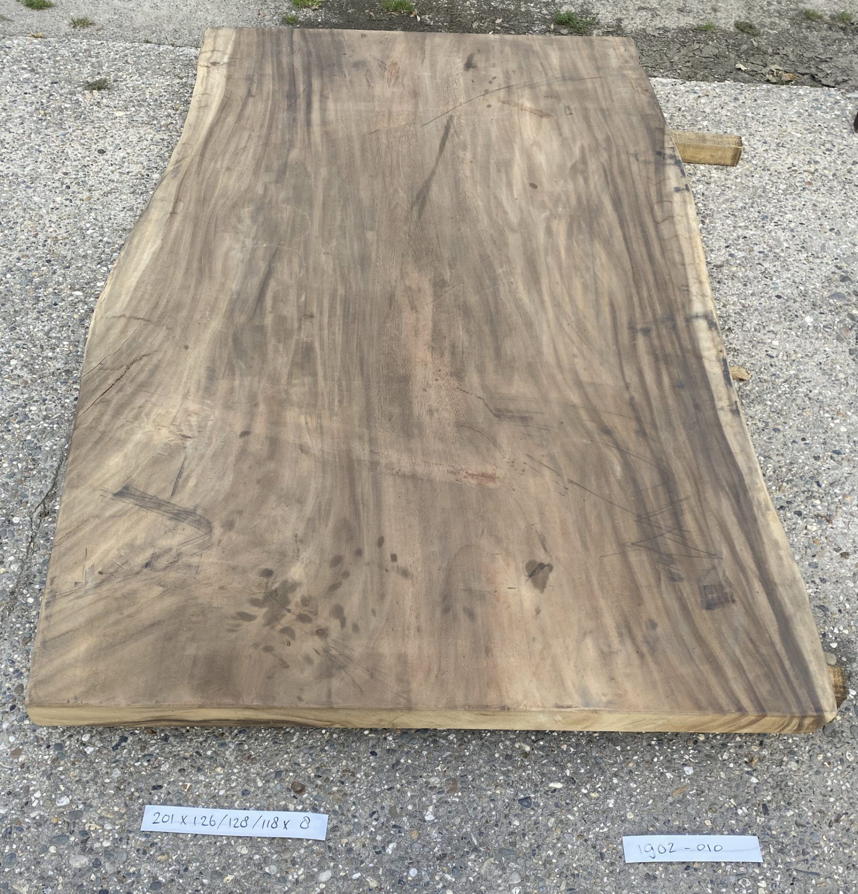 Dit tafelblad is voorzien van twee stalen pinnen tegen het krom trekken van het blad. Het blad is volledig uit één deel (plak van een boom). Hierdoor heeft het blad echt de natuurlijke uitstraling. Het blad op de foto is nog onbehandeld en opgeschuurd. Wanneer het blad geschuurd en behandeld wordt krijgt u nog mooier de tekeningen van het hout te zien. Al onze suar tafelbladen zijn te bezichtigen in onze showroom, zo weet u precies wat u kunt verwachten van het blad. Wij adviseren u dan ook om wanneer deze mogelijkheid er is langs te komen in onze showroom. Voor openingstijden en adres kunt u hier terecht.