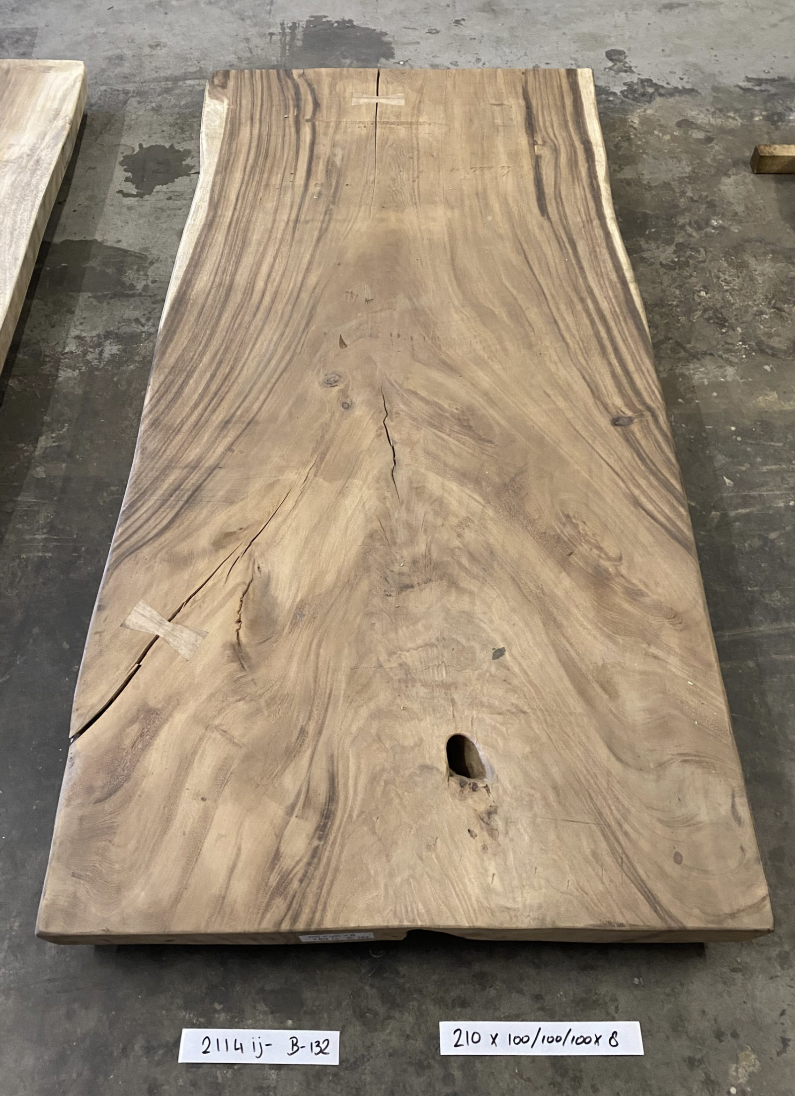 Dit tafelblad is voorzien van twee stalen pinnen tegen het krom trekken van het blad. Het blad is volledig uit één deel (plak van een boom). Hierdoor heeft het blad echt de natuurlijke uitstraling. Het blad op de foto is nog onbehandeld en opgeschuurd. Wanneer het blad geschuurd en behandeld wordt krijgt u nog mooier de tekeningen van het hout te zien. Al onze suar tafelbladen zijn te bezichtigen in onze showroom, zo weet u precies wat u kunt verwachten van het blad. Wij adviseren u dan ook om wanneer deze mogelijkheid er is langs te komen in onze showroom. Voor openingstijden en adres kunt u hier terecht.