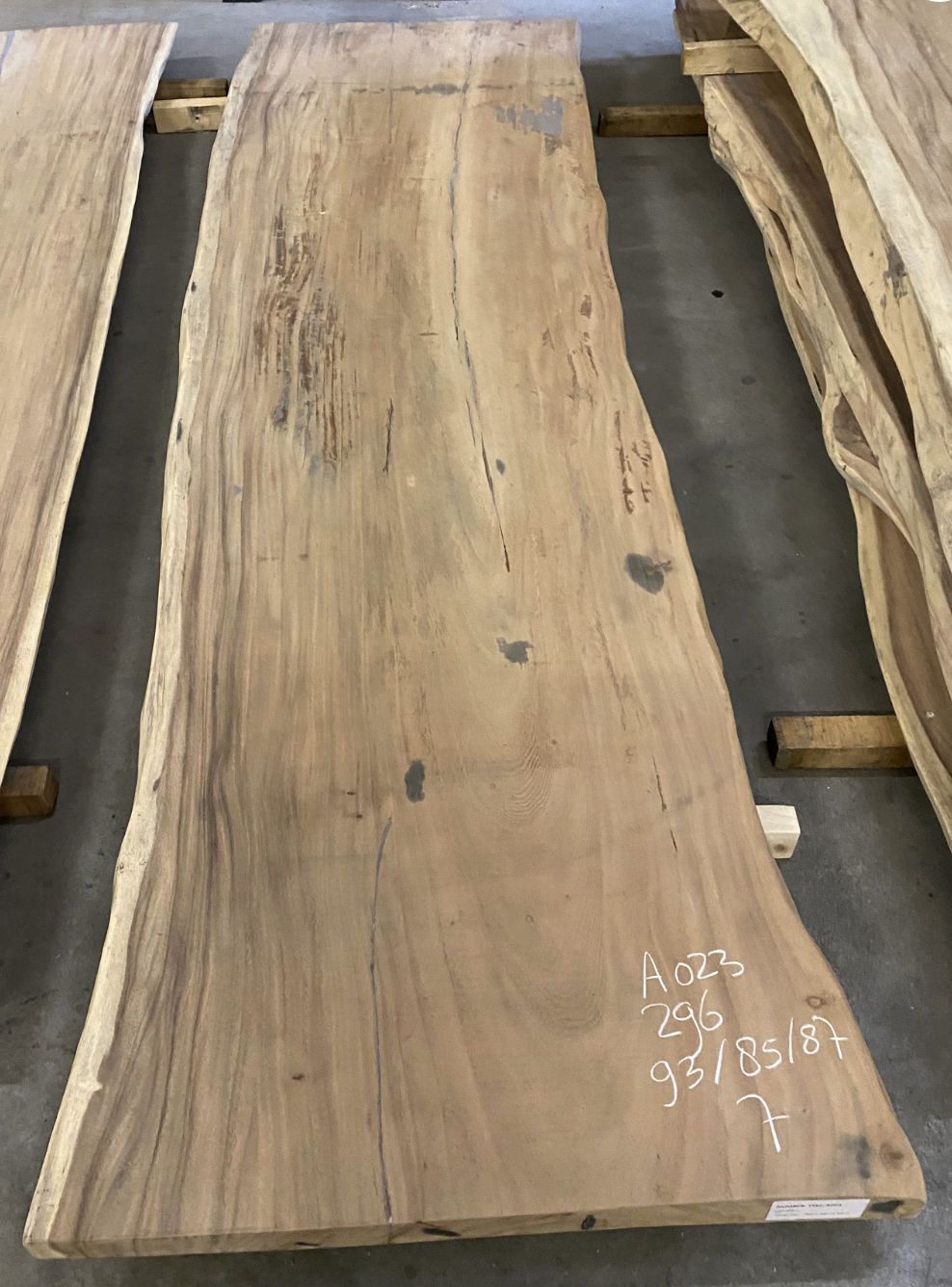 Dit tafelblad is voorzien van twee stalen pinnen tegen het krom trekken van het blad. Het blad is volledig uit één deel (plak van een boom). Hierdoor heeft het blad echt de natuurlijke uitstraling. Het blad op de foto is nog onbehandeld en opgeschuurd. Wanneer het blad geschuurd en behandeld wordt krijgt u nog mooier de tekeningen van het hout te zien. Al onze suar tafelbladen zijn te bezichtigen in onze showroom, zo weet u precies wat u kunt verwachten van het blad. Wij adviseren u dan ook om wanneer deze mogelijkheid er is langs te komen in onze showroom. Voor openingstijden en adres kunt u hier terecht.