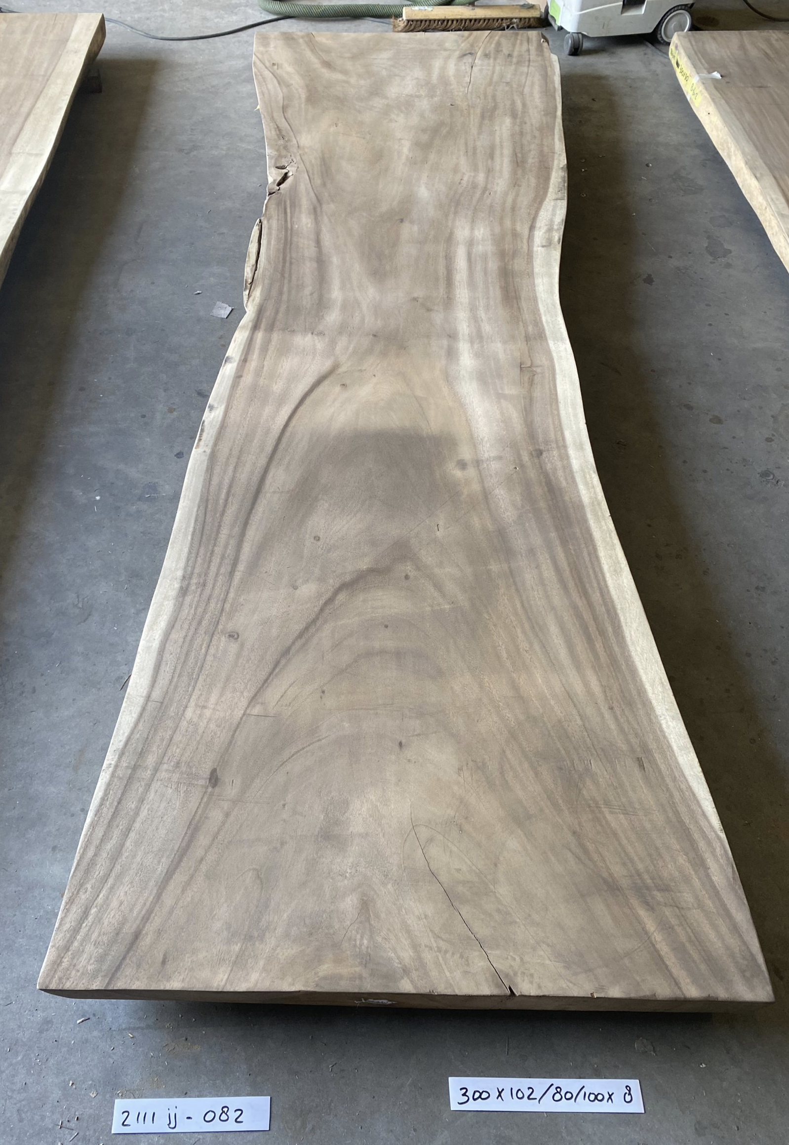 Dit tafelblad is voorzien van twee stalen pinnen tegen het krom trekken van het blad. Het blad is volledig uit één deel (plak van een boom). Hierdoor heeft het blad echt de natuurlijke uitstraling. Het blad op de foto is nog onbehandeld en opgeschuurd. Wanneer het blad geschuurd en behandeld wordt krijgt u nog mooier de tekeningen van het hout te zien. Al onze suar tafelbladen zijn te bezichtigen in onze showroom, zo weet u precies wat u kunt verwachten van het blad. Wij adviseren u dan ook om wanneer deze mogelijkheid er is langs te komen in onze showroom. Voor openingstijden en adres kunt u hier terecht.