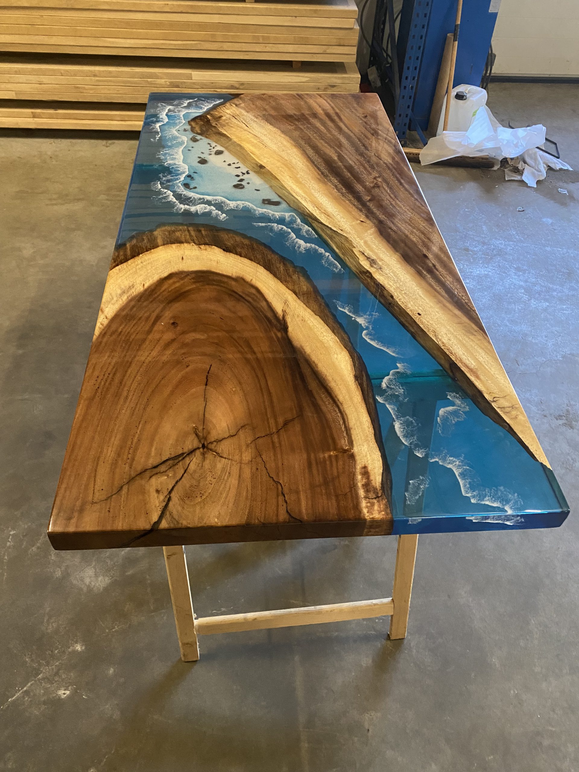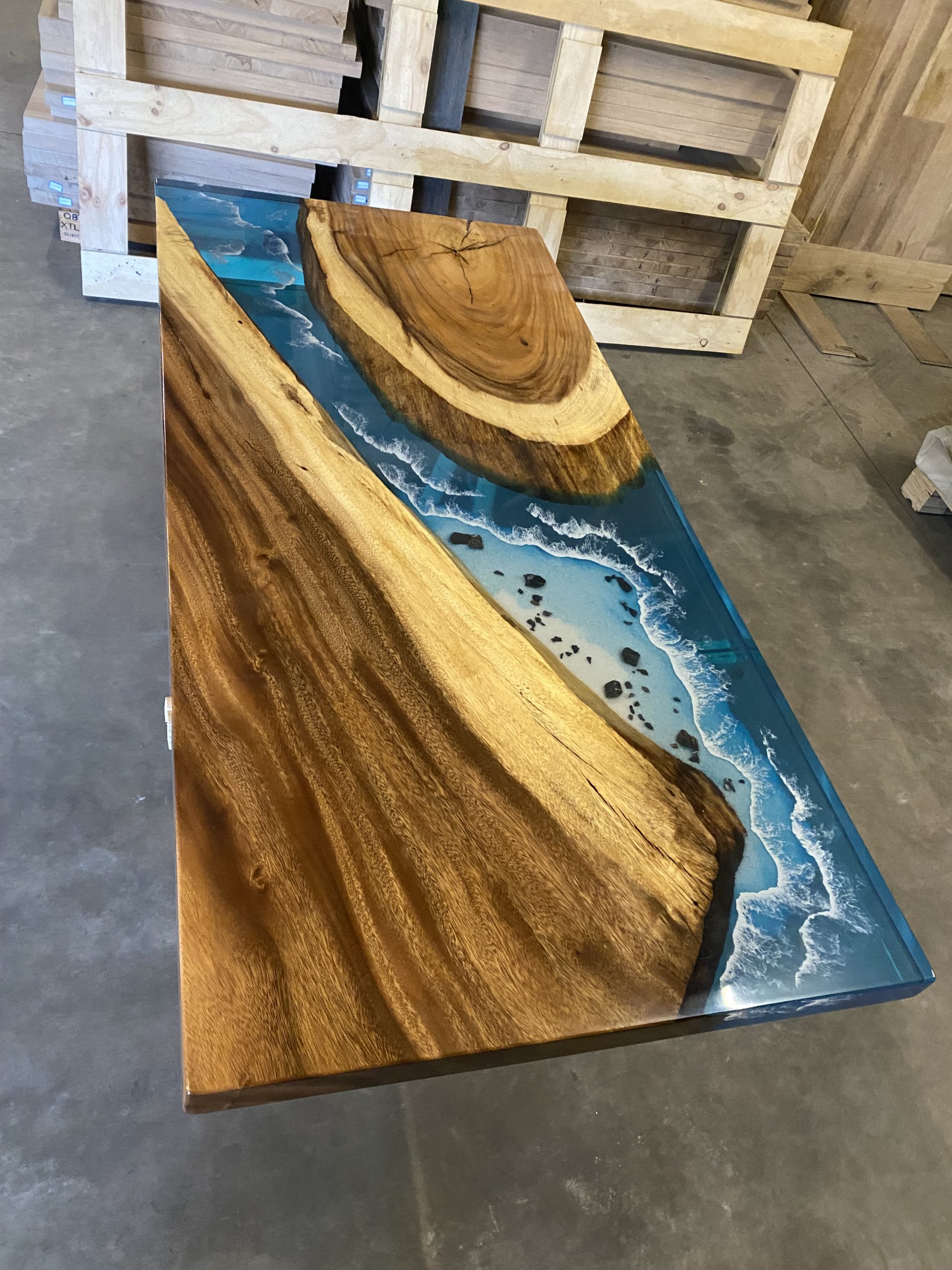 Prachtige tafelblad met epoxy. In de epoxy is een strand effect gemaakt doormiddel van golven en steentjes. Hiermee haalt u echt een uniek tafelblad in huis. Het hout wat is gebruikt in het tafelblad is Suar hout. Dit is als afwerking volledig overgoten met epoxy, hierdoor heet het een mooie glanzende afwerking.
