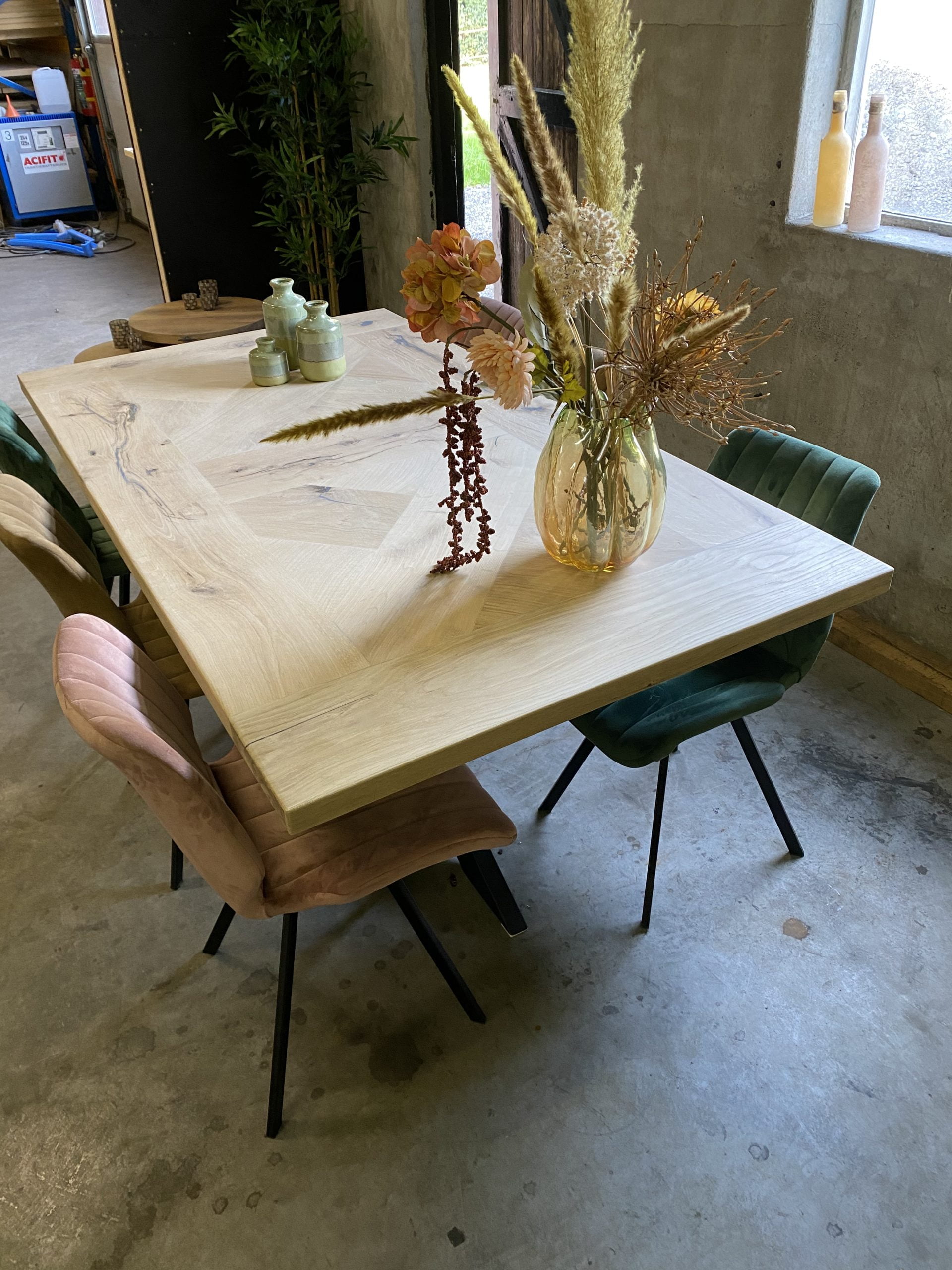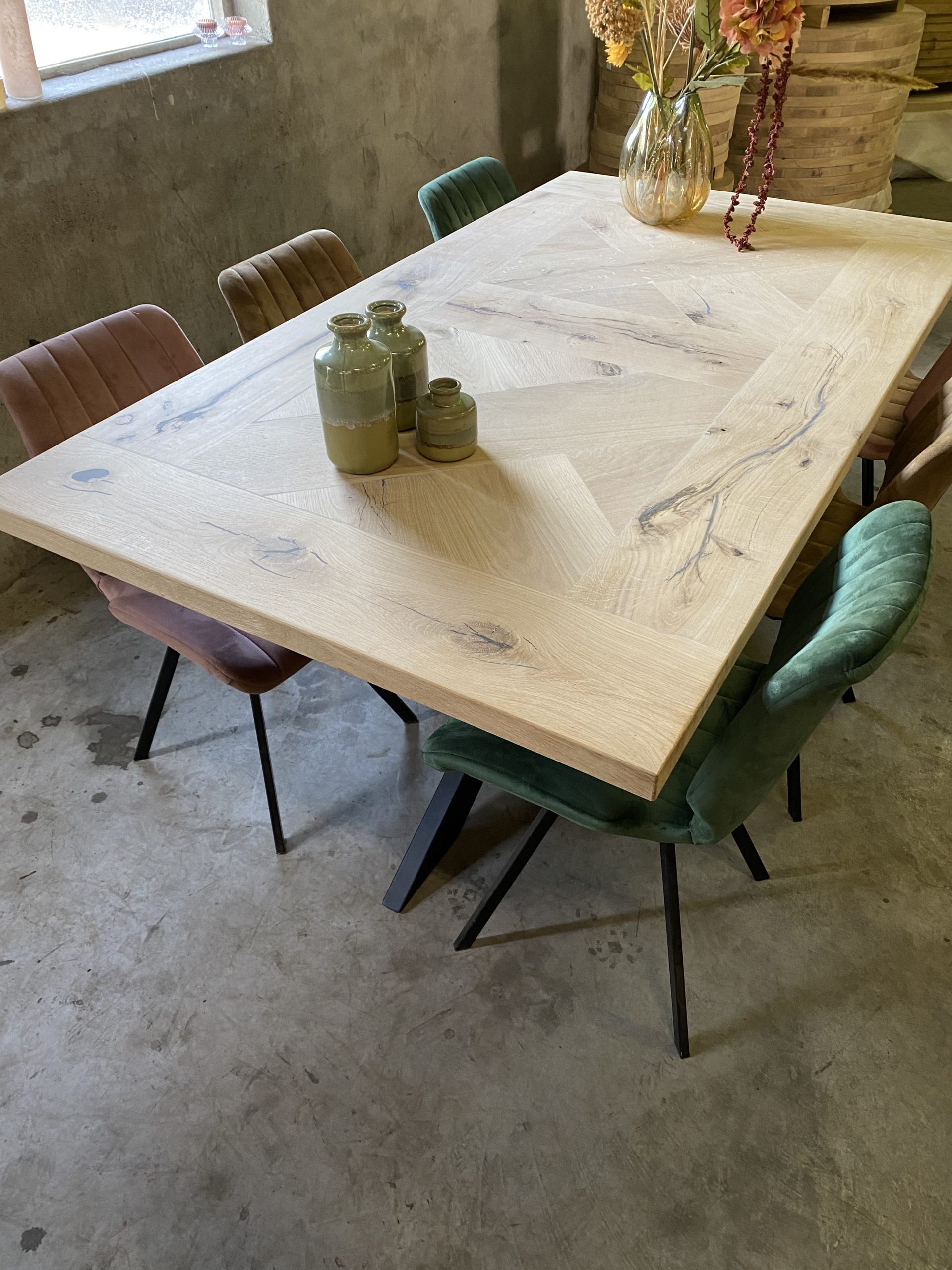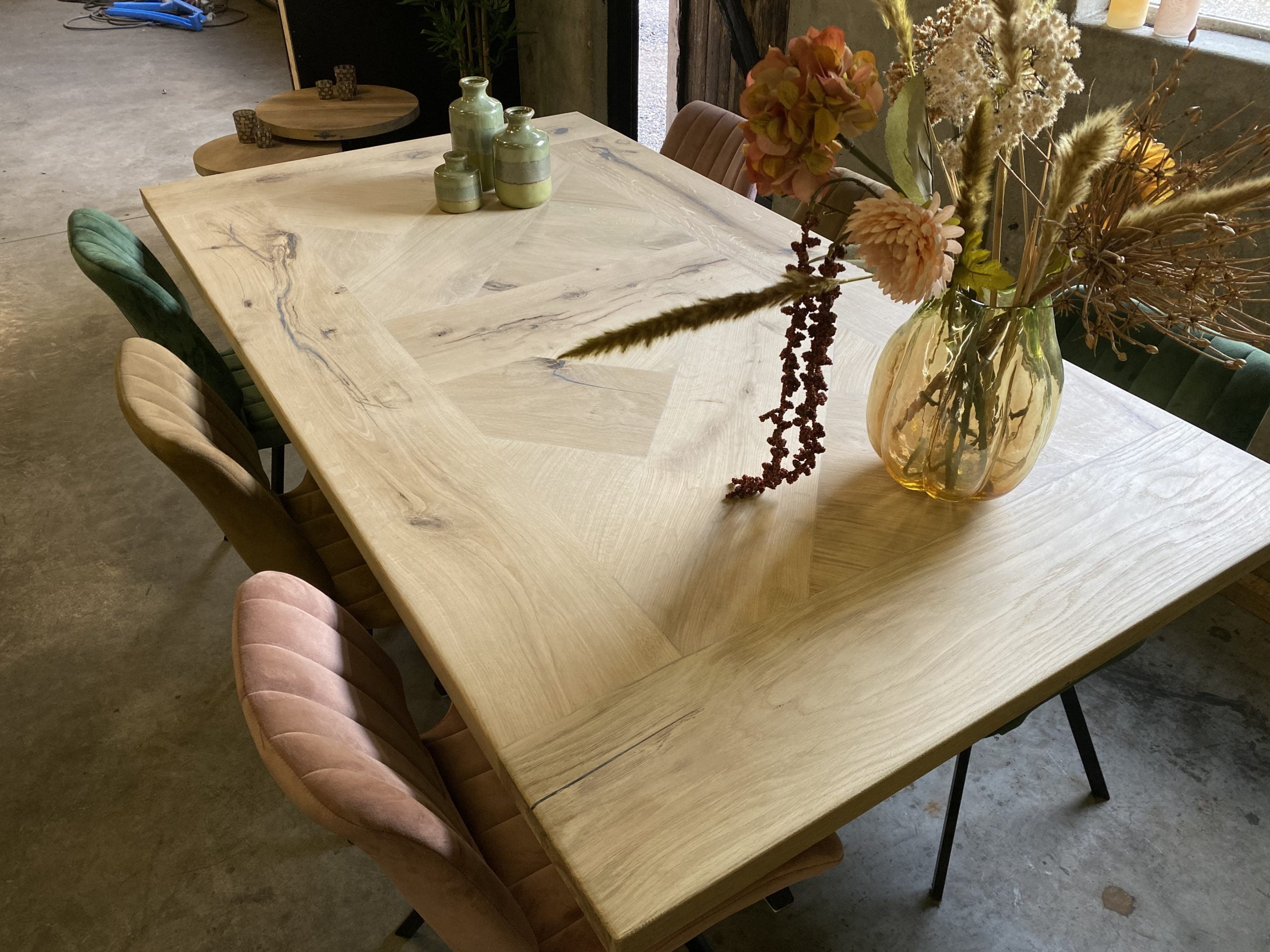 Bij De Tafelboerderij hebben we een uitgebreid assortiment tafelbladen, waaronder het prachtige eiken kruis tafelblad. Deze bladen zijn beschikbaar in verschillende maten en we hebben er altijd meerdere op voorraad. Bezoek onze showroom om persoonlijk uw perfecte blad te selecteren. We adviseren u langs te komen, zodat u precies weet welk blad u krijgt bij uw bestelling. Onze eiken kruis tafelbladen hebben een omlijsting van 10 cm, wat zorgt voor een klassieke en tijdloze uitstraling.