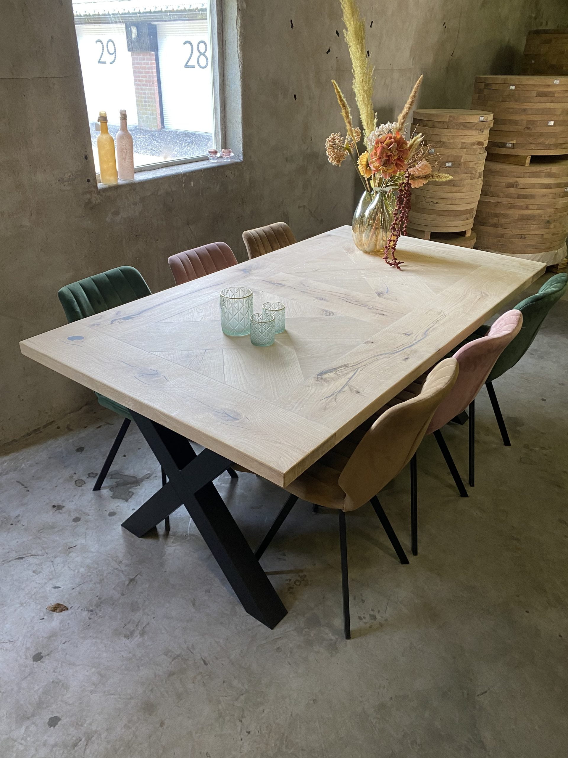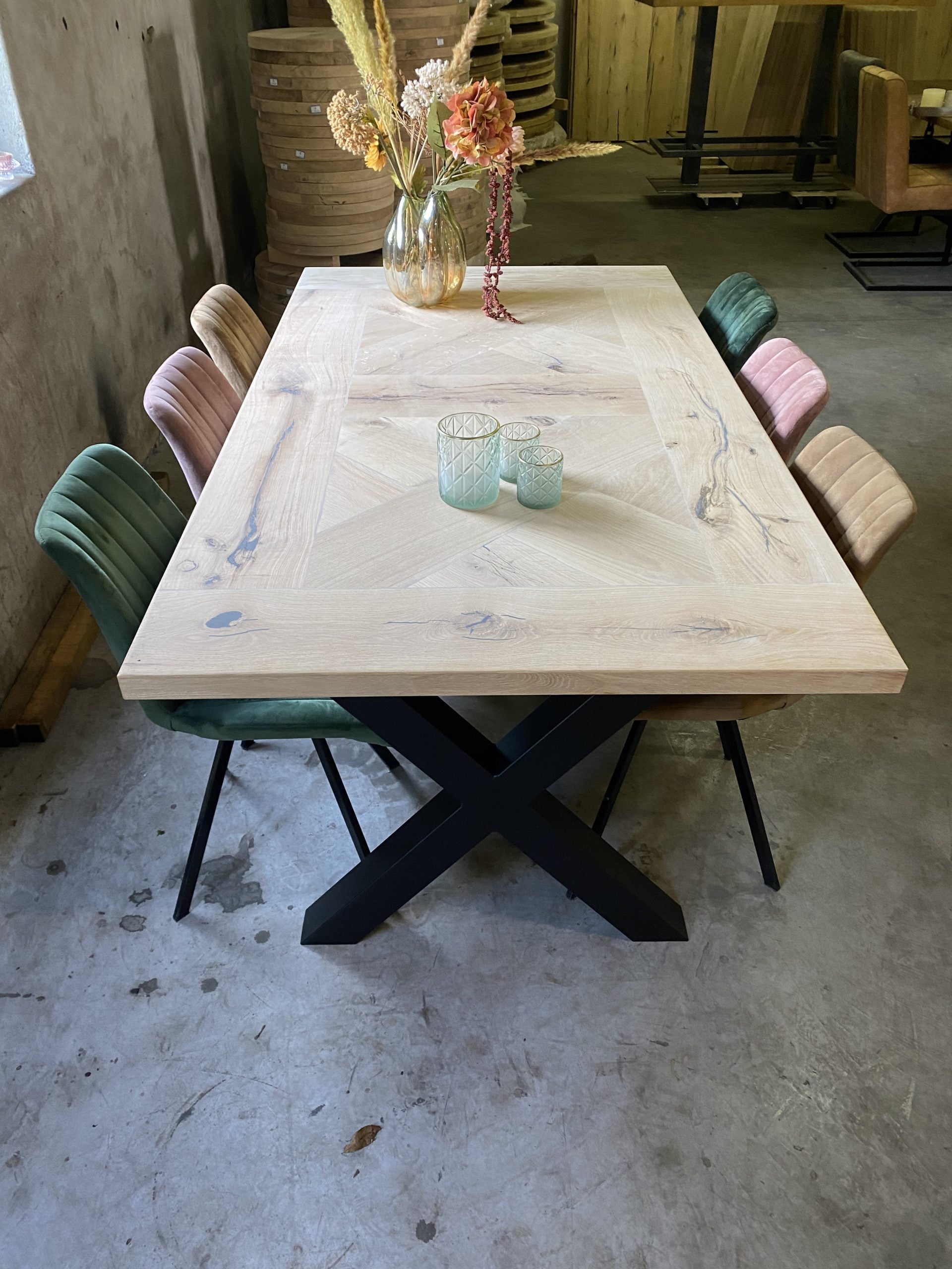 Bij de VloerenFabriek hebben wij een groot assortiment tafelbladen, hieronder valt ook dit prachtige eiken kruis tafelblad. Wij hebben onze eiken Kruis tafelbladen in veel verschillende maten waarvan wij er altijd meerdere op voorraad hebben. Bij ons in de showroom kunt u daarom altijd uw eigen blad uitzoeken. Ons advies is ook om bij ons langs te komen zodat u precies weet welk blad u kunt verwacht bij bestelling. Onze eiken kader tafelbladen hebben rondom een kader van 10cm. Dit geeft een mooie klassieke uitstraling. Met een eiken kader tafelbladen heeft u een mooie tijdloze tafel.