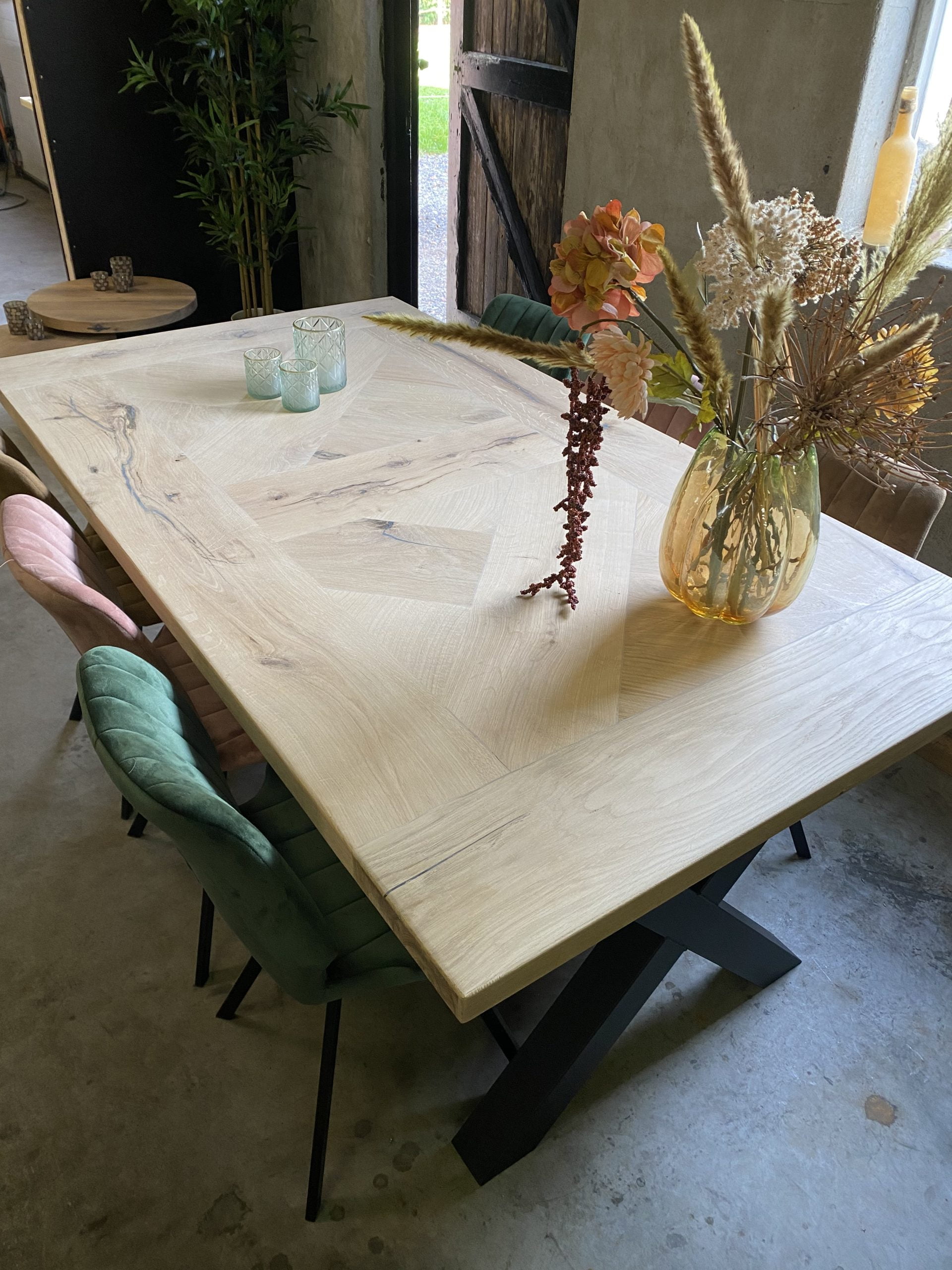 Onze eiken kruis tafelbladen bestaan uit 1, 2, of 3 kruizen. De tafels zijn volledig 4cm dik.