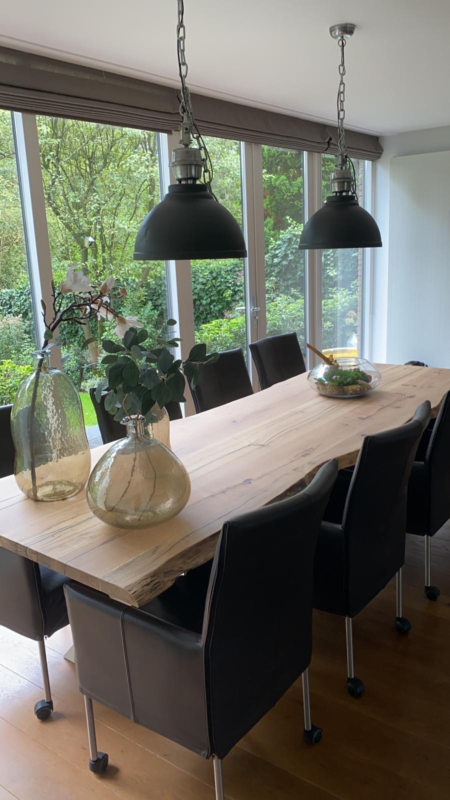 Voor een strak, modern effect kunnen wij het blad afwerken met vier lagen lak/verf in zwart. Deze behandeling zorgt voor een egaal dekkende kleur, terwijl de houtstructuur subtiel zichtbaar blijft.