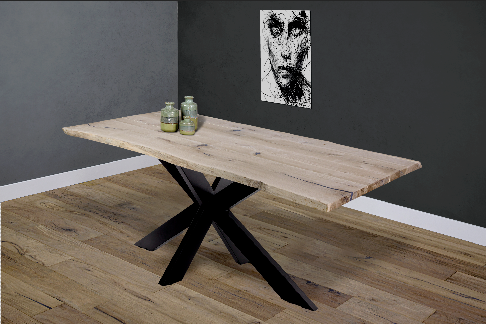 Onze massief eiken boomstam tafelbladen zijn standaard opgevuld en machinaal geschuurd, en kunnen op verschillende manieren worden behandeld. Iedere afwerking benadrukt het natuurlijke karakter van het hout, met behoud van de unieke noesten, nerven en houttekening.