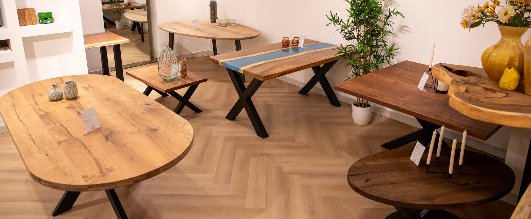 Sinds augustus 2025 beschikken wij over een prachtige nieuwe showroom waar u uw eettafel volledig naar wens kunt samenstellen. Doordat wij alle tafelbladen in grote aantallen op voorraad hebben in onze werkplaats en ons magazijn, kunt u aan de hand van foto’s zelf uw ideale tafelblad uitkiezen. Zo weet u vooraf precies wat u kunt verwachten bij levering.